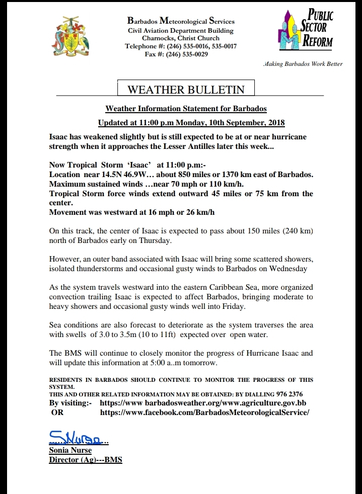 Isaac s'est légèrement affaibli, mais on s'attend toujours à ce qu'il soit à la force des ouragans ou près de lui quand il approchera des Petites Antilles plus tard cette semaine ... Maintenant, la tempête tropicale 'Isaac' à 23h00: ou 1370 km à l'est de la Barbade. Vents maximums soutenus… près de 70 mi / h ou 110 km / h. Les vents de la tempête tropicale s'étendent vers l'extérieur, à 45 milles ou 75 km du centre. Le mouvement était à l'ouest à 26 km / h ou 16 mi / h. Sur cette piste, le centre d'Isaac devrait passer à environ 150 miles (240 km) au nord de la Barbade tôt jeudi. Cependant, une bande extérieure associée à Isaac apportera des averses éparses, des orages isolés et des rafales de vent occasionnelles à la Barbade mercredi Alors que le système se déplace vers l’ouest dans la mer des Caraïbes, Isaac devrait toucher la Barbade des averses et des rafales occasionnelles jusqu’à vendredi. Les conditions de la mer devraient également se détériorer car le système traverse la zone avec des houles de 3,0 à 3,5 m (10 à 11 pieds) attendues en eau libre. Le BMS continuera de suivre de près l’évolution de l’ouragan Isaac et mettra à jour ces informations à 5 heures du matin demain.