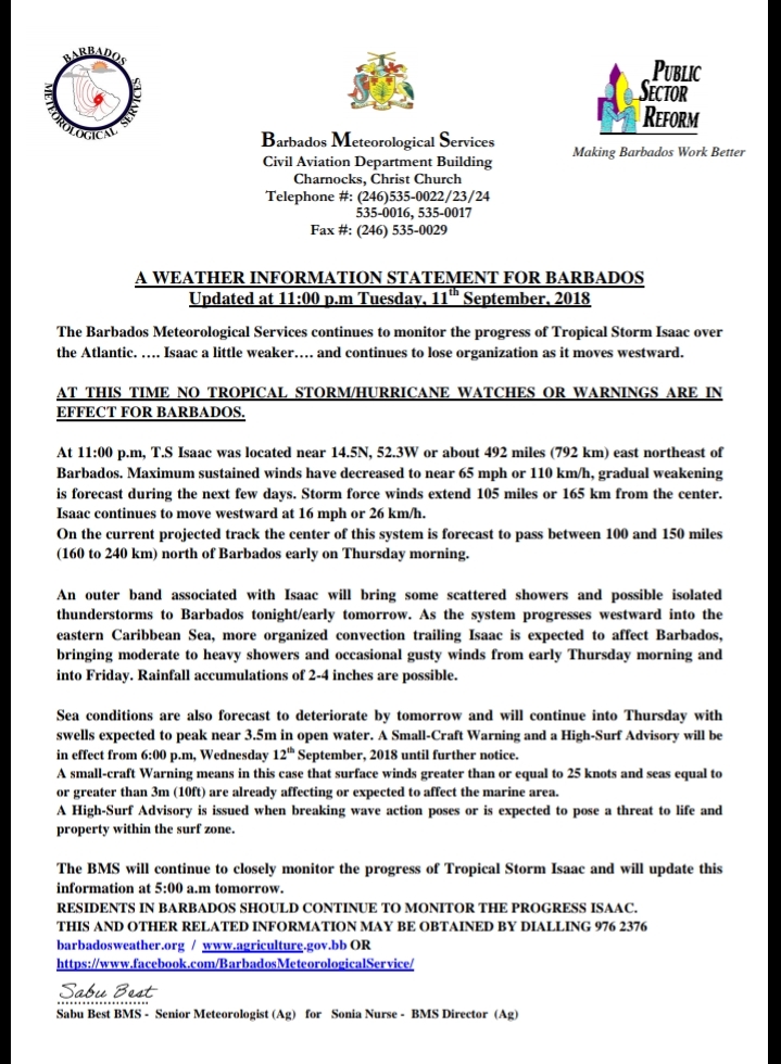 Los Servicios Meteorológicos de Barbados continúan monitoreando el progreso de la Tormenta Tropical Isaac sobre el Atlántico. ... Isaac un poco más débil ... y continúa perdiendo organización a medida que se mueve hacia el oeste. EN ESTE MOMENTO NO ESTÁN EN EFECTO VIGILANCIA O AVISOS DE TORMENTA TROPICAL / HURACAN PARA BARBADOS. A las 11:00 pm, TS Isaac se encontraba cerca de 14.5N, 52.3W o aproximadamente 492 millas (792 km) al noreste de Barbados. Los vientos máximos sostenidos han disminuido a cerca de 65 mph o 110 km / h, se pronostica un debilitamiento gradual durante los próximos días. Los vientos con fuerza de tormenta se extienden 105 millas o 165 km desde el centro. Isaac continúa moviéndose hacia el oeste a 16 mph o 26 km / h. En la vía proyectada actual, se pronostica que el centro de este sistema pasará entre 100 y 150 millas (160 a 240 km) al norte de Barbados a primera hora de la mañana del jueves. Una banda externa asociada con Isaac traerá algunas lluvias dispersas y posibles tormentas eléctricas aisladas a Barbados esta noche / mañana temprano. A medida que el sistema avanza hacia el oeste hacia el este del mar Caribe, se espera que la convección más organizada de Isaac afecte a Barbados, provocando lluvias moderadas a intensas y vientos racheados ocasionales desde el jueves por la mañana temprano hasta el viernes. Se pueden acumular precipitaciones de 2-4 pulgadas. También se pronostica que las condiciones del mar empeorarán para mañana y continuarán hasta el jueves, y se prevé que las marejadas alcanzarán un máximo cercano a los 3,5 millones en mar abierto. Un aviso de artesanía pequeña y un aviso de surf alto estará vigente a partir de las 6:00 p.m., el miércoles 12 de septiembre de 2018 hasta nuevo aviso. Una Advertencia de embarcaciones pequeñas significa en este caso que vientos de superficie mayores o iguales a 25 nudos y mares iguales o mayores a 3 m (10 pies) ya están afectando o se espera que afecten al área marina. Se emite un aviso de alto riesgo cuando la acción de romper olas plantea o se espera que represente una amenaza para la vida y la propiedad dentro de la zona de oleaje. El BMS continuará monitoreando de cerca el progreso de la Tormenta Tropical Isaac y actualizará esta información a las 5:00 a.m. de la mañana.