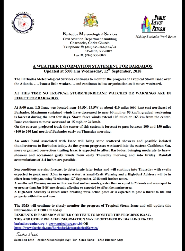 Los Servicios Meteorológicos de Barbados continúan monitoreando el progreso de la Tormenta Tropical Isaac sobre el Atlántico. ... Isaac un poco más débil ... y continúa perdiendo organización a medida que se mueve hacia el oeste. EN ESTE MOMENTO NO ESTÁN EN EFECTO VIGILANCIA O AVISOS DE TORMENTA TROPICAL / HURACAN PARA BARBADOS. A las 5:00 a.m., TS Isaac se encontraba cerca de 14.5N, 53.5W o aproximadamente 410 millas (660 km) al noreste de Barbados. Los vientos máximos sostenidos han disminuido a cerca de 60 mph o 95 km / h, se pronostica un debilitamiento gradual durante los próximos días. Los vientos con fuerza de tormenta se extienden 105 millas o 165 km desde el centro. Isaac continúa moviéndose hacia el oeste a 15 mph o 24 km / h. En la vía proyectada actual, se pronostica que el centro de este sistema pasará entre 100 y 150 millas (160 a 240 km) al norte de Barbados a primera hora de la mañana del jueves. Una banda externa asociada con Isaac traerá algunas lluvias dispersas y posibles tormentas eléctricas aisladas a Barbados en la actualidad. A medida que el sistema avanza hacia el oeste hacia el este del mar Caribe, se espera que la convección más organizada de Isaac afecte a Barbados, provocando lluvias moderadas a intensas y vientos racheados ocasionales desde el jueves por la mañana temprano hasta el viernes. Se pueden acumular precipitaciones de 2-4 pulgadas. También se pronostica que las condiciones del mar empeorarán el día de hoy y continuarán hasta el jueves, y se prevé que las marejadas alcanzarán un máximo cercano a los 3,5 millones en aguas abiertas. Una Advertencia de Pequeñas embarcaciones y una Advertencia para surfear estará vigente a partir de las 6:00 p. M., Hoy miércoles 12 de septiembre de 2018 hasta nuevo aviso. Una Advertencia de embarcaciones pequeñas significa en este caso que vientos de superficie mayores o iguales a 25 nudos y mares iguales o mayores a 3 m (10 pies) ya están afectando o se espera que afecten al área marina. Se emite un aviso de alto riesgo cuando la acción de romper olas plantea o se espera que represente una amenaza para la vida y la propiedad dentro de la zona de oleaje. El BMS continuará monitoreando de cerca el progreso de la Tormenta Tropical Isaac y actualizará esta información a las 11:00 am de hoy
