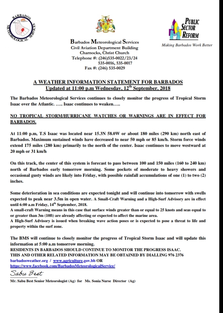 Los Servicios Meteorológicos de Barbados continúan monitoreando de cerca el progreso de la Tormenta Tropical Isaac sobre el Atlántico. ... Isaac sigue debilitándose ... NO HAY VIGILANCIA O AVISOS DE TORMENTA TROPICAL / HURACAN EN EFECTO PARA BARBADOS. A las 11:00 pm, TS Isaac se encontraba cerca de 15.3N 58.0W o cerca de 180 millas (290 millas) al noreste de Barbados. Los vientos máximos sostenidos han disminuido a cerca de 50 mph o 85 km / h. Los vientos con fuerza de tormenta se extienden 175 millas (280 km) principalmente al norte del centro. Isaac continúa moviéndose hacia el oeste a 20 mph o 31 km / h. En esta pista, se pronostica que el centro de este sistema pasará entre 100 y 150 millas (160 a 240 km) al norte de Barbados a primera hora de la mañana. Algunas bolsas de lluvia moderada a fuerte y vientos racheados ocasionales probablemente lleguen al viernes, con posibles acumulaciones de lluvia de una (1) a dos (2) pulgadas. Se espera algún deterioro en las condiciones del mar esta noche y continuará en el futuro con olas que se espera que lleguen a cerca de los 3.5m en aguas abiertas. Una alerta de pequeño astillero y un aviso de alta resaca están vigentes hasta las 6:00 a.m. del viernes 14 de septiembre de 2018. Una advertencia de pequeña embarcación significa en este caso vientos de superficie mayores o iguales a 25 nudos y mares iguales o más de 3 m (10 pies) ya están afectando o se espera que afecte el área marina. Se emite un aviso de alto riesgo cuando la acción de romper olas plantea o se espera que represente una amenaza para la vida y la propiedad dentro de la zona de oleaje. El BMS continuará monitoreando de cerca el progreso de la Tormenta Tropical Isaac y actualizará esta información a las 5:00 a.m. mañana por la mañana.